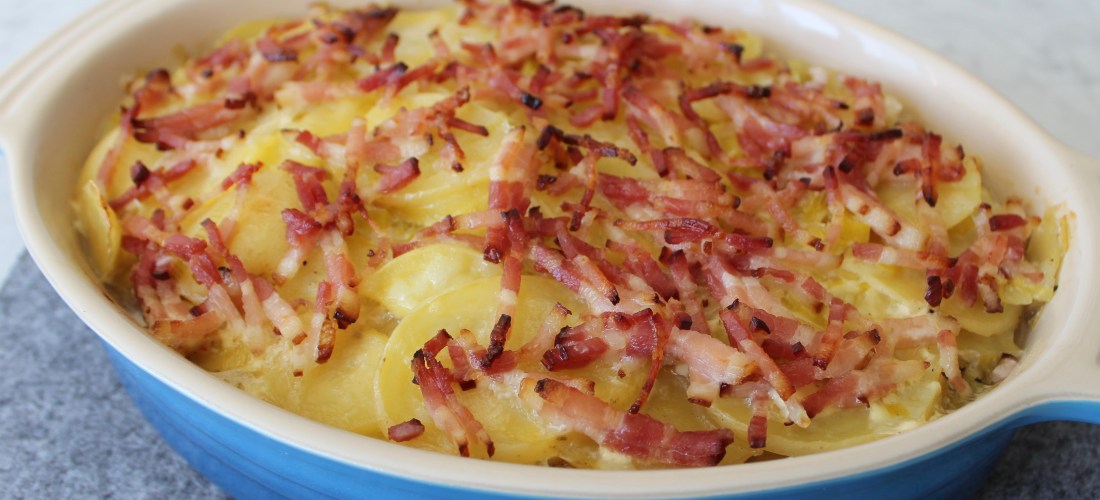 After half an hour in the oven, remove the gratin from the oven, remove the foil and scatter over the bacon. Return to the oven and cook for a further ten minutes or until golden and crisp.